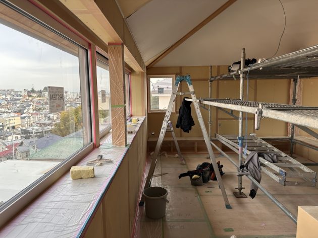 敷地は高台にあり見晴らしが素晴らしかったため、家族が長い時間を過ごすLDKを2階に配置しました。LDKは屋根なりの斜め天井で伸びやかな空間になっています。また街並みを眺められる出窓の長さは5.2mと圧巻です。